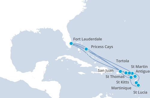 20 nights. Bahamas, Puerto Rico, Saint Kitts and Nevis, Saint Lucia, Martinique, Antigua and Barbuda, United States of America, Virgin Islands (U.S.), Sint Maarten (Dutch part), Virgin Islands (British)